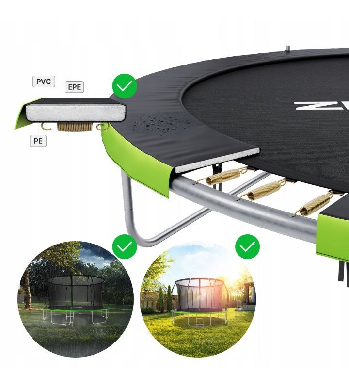 Równie ważnym elementem trampoliny ogrodowej ZIPRO JumpPro PREMIUM jest batut wykonany z wytrzymałego materiału, z dodatkowo wzmocnionymi krawędziami. W połączeniu z licznymi i gęsto rozmieszczonymi sprężynami gwarantuje dużą nośność oraz trwałość. Dzięki temu trampolina ogrodowa dla dzieci ZIPRO JumpPro PREMIUM jest inwestycją, która posłuży Twojej rodzinie przez lata.