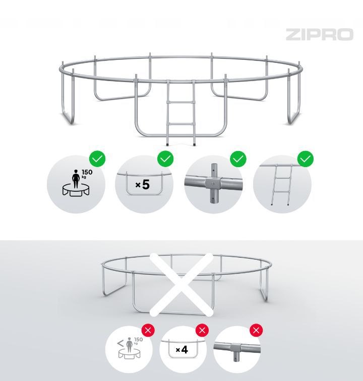 Trampolina dla dzieci ZIPRO JumpPro PREMIUM to łatwość i szybkość montażu oraz zwiększona wytrzymałość, zapewniane przez innowacyjny system CROSS-SECTION, którego nie znajdziesz nigdzie indziej. Oferowany model wyróżnia się także lepszą stabilnością gwarantowaną przez większą liczbę nóg. Dzięki nim trampolina ogrodowa pozostaje na swoim miejscu nawet podczas intensywnego użytkowania, a siła oddziałująca na jej konstrukcję w trakcie skakania i lądowania jest równomiernie rozkładana.