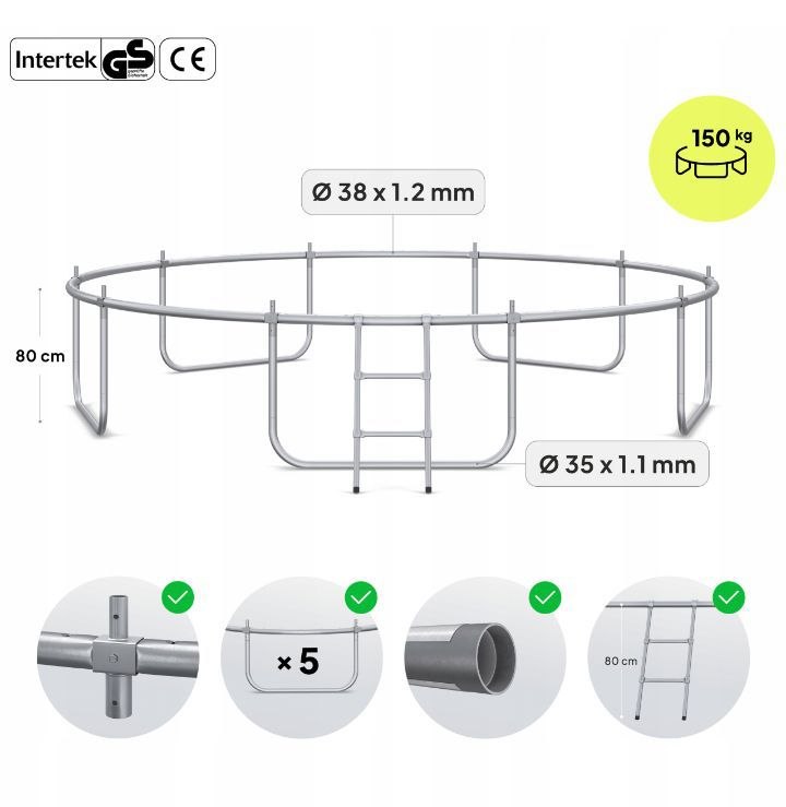 Wysoka wytrzymałość do 150 kg – Solidna konstrukcja i rury stalowe z wzmocnionymi łączeniami gwarantują stabilność.