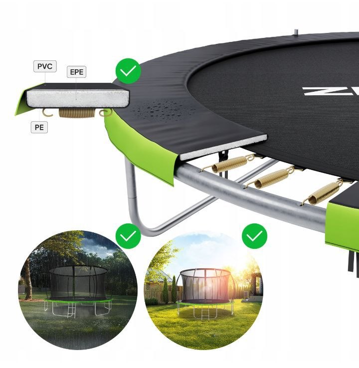 Równie ważnym elementem trampoliny ogrodowej ZIPRO JumpPro PREMIUM jest batut wykonany z wytrzymałego materiału, z dodatkowo wzmocnionymi krawędziami. W połączeniu z licznymi i gęsto rozmieszczonymi sprężynami gwarantuje dużą nośność oraz trwałość. Dzięki temu trampolina ogrodowa dla dzieci ZIPRO JumpPro PREMIUM jest inwestycją, która posłuży Twojej rodzinie przez lata.